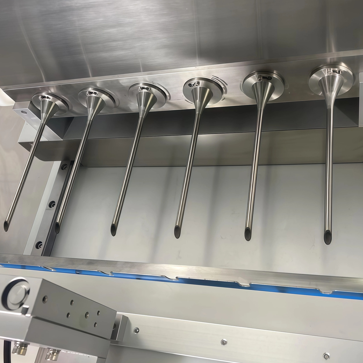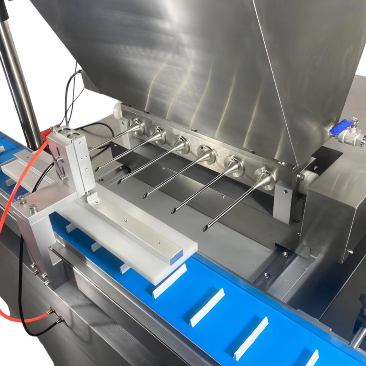 Изделия помещаются на транспортер, где фиксируются прижимным устройством. Горизонтальный дозатор-инжектор с шестью иглами прокалывает и равномерно наполняет изделия. Независимые цилиндры и серводвигатель обеспечивают точность дозирования, регулировку глубины прокола и объёма подачи.