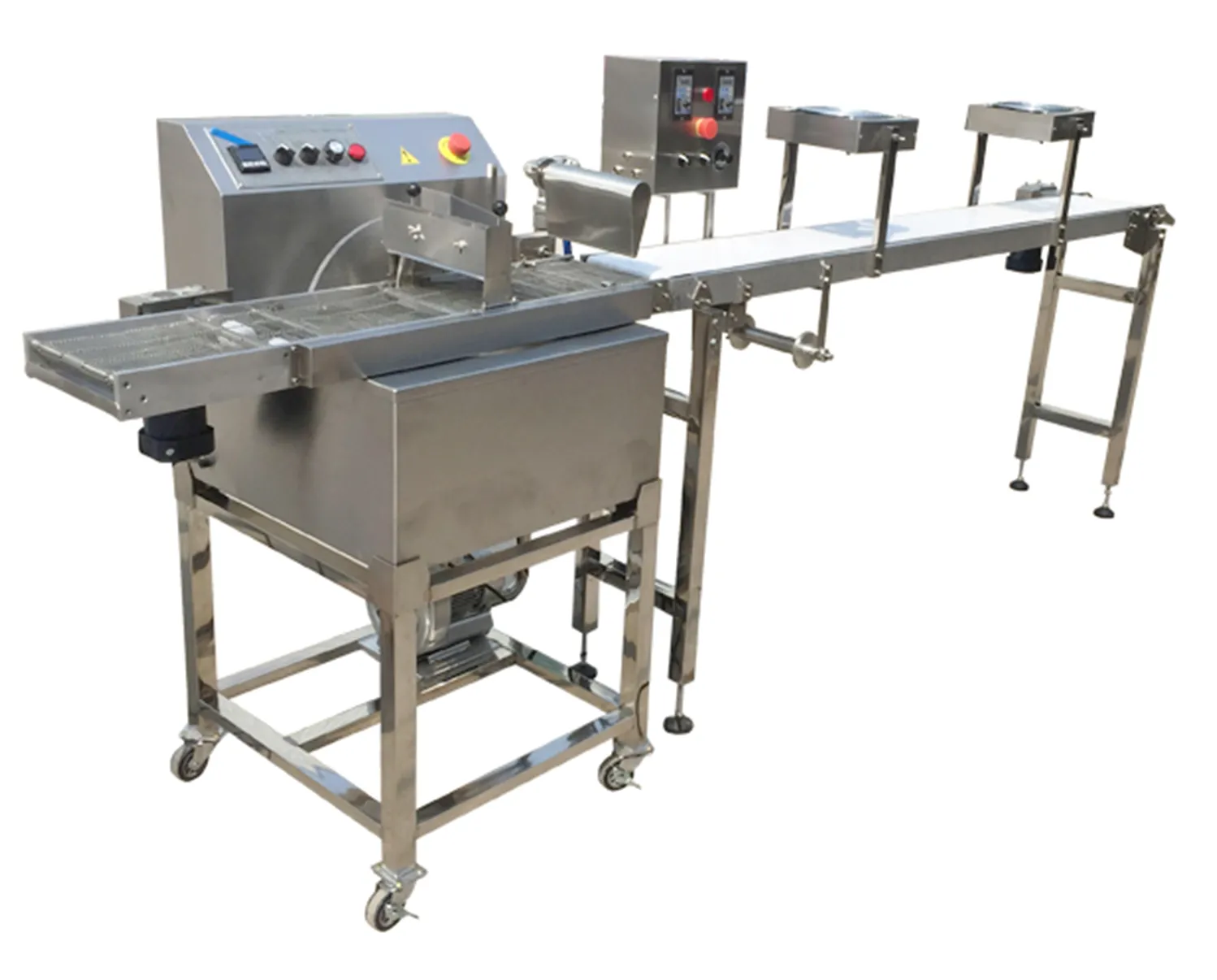 Предназначена для покрытия шоколадной глазурью вафель, печенья, пряников, бисквитов, зефиров, мармелада и др. Стабильно глазирует как на малых (1 м/мин), так и на высоких (7 м/мин) скоростях. Глазурь, циркулирующая внутри глазировочной машины, лишена вероятности растемперирования, т.к. машина снабжена устройством, которое поддерживает заданную температуру как внутри приемной ванны, так и во внутреннем рабочем пространстве машины.