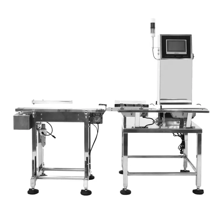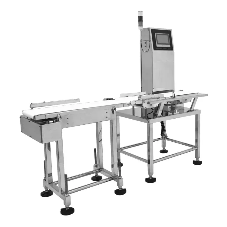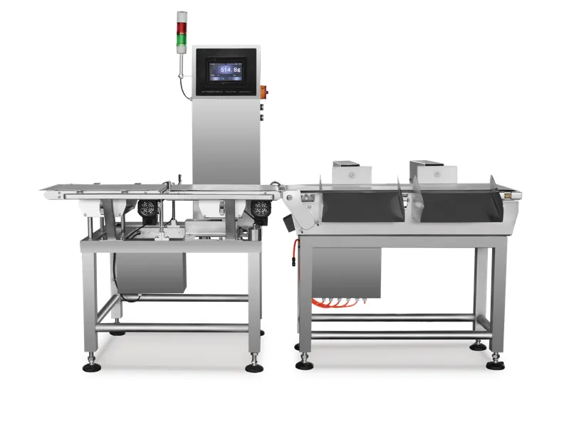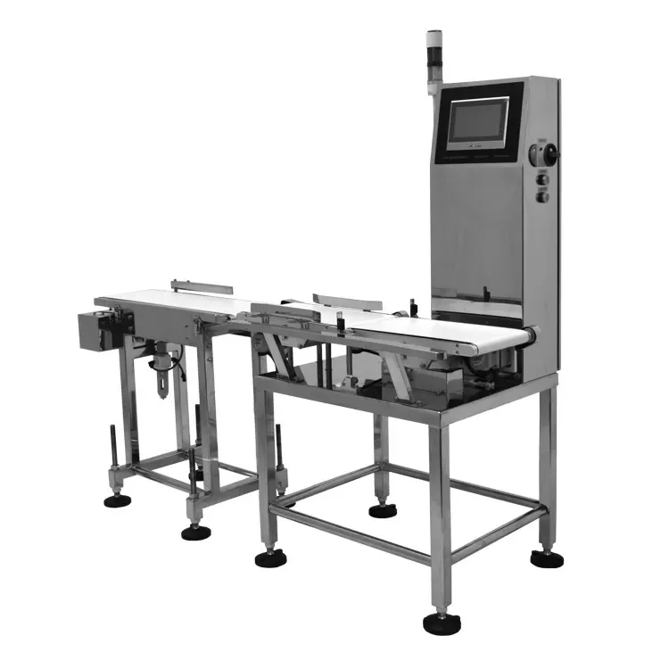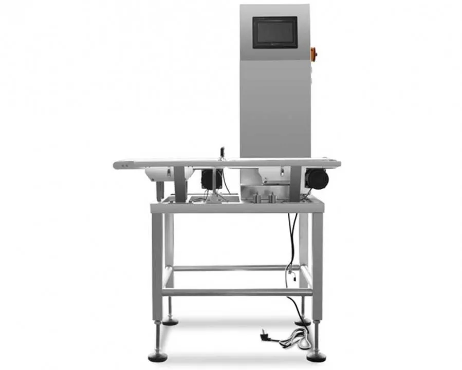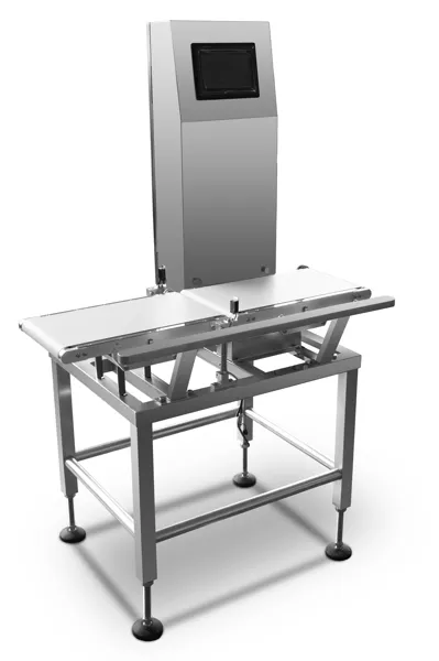 Чеквейер имеет ленточный транспортер, также он оснащен тензометрическим датчиком повышенной точности и весьма быстрым пневмотолкателем (опционально за доп. плату).