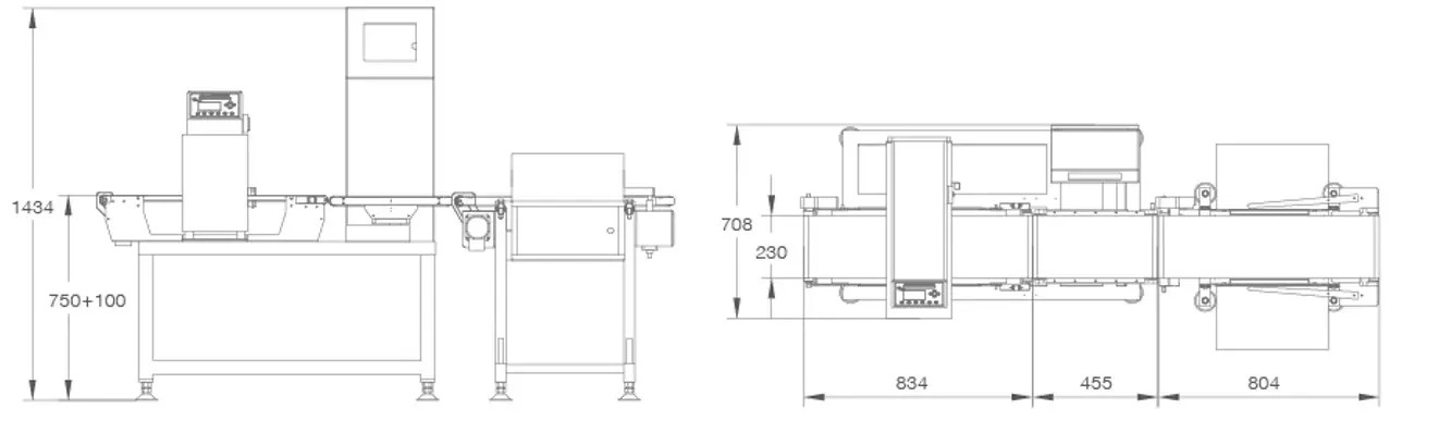 - В базовой комплектации оборудование поставляется без отбраковщика. При обнаружении отклонения в весе комбичекер останавливается и включается световая и звуковая сигнализация.