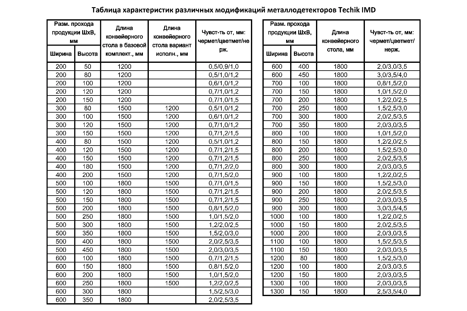 В зависимости от типа производства металлодетекторы подбираются под параметры проверяемых продуктов. Таблица модификаций Techik IMD приведена ниже. Подача продукта на конвейерную ленту происходит в ручном режиме либо с конвейерной линии.