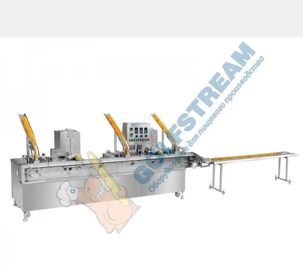 Она состоит из: направляющих каналов (фидеров) с вибратором и раздвижной системой для подачи печенья разного размера, устройства намазки, устройства склейки, отводящего транспортера. Подача начинки осуществляется стабильно при помощи надежного насоса. Опция автоматического подогрева начинки. Загрузка в направляющие каналы производится вручную или транспортером.