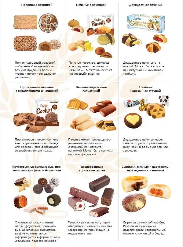 - Печенье, нарезанное гильотиной, в форме песочных палочек с начинкой, квадратиков или прямоугольников с открытой или закрытой начинкой внутри;