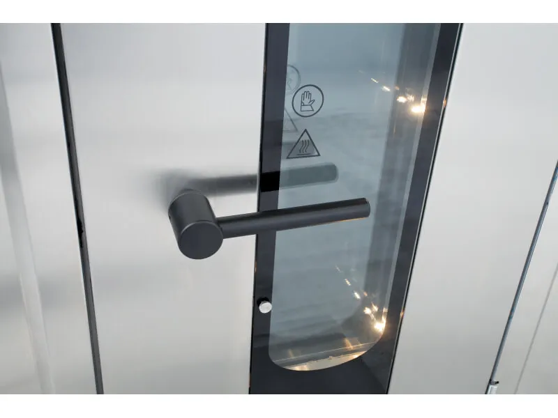 В новой системе пар вырабатывается в профилях, которые находятся внутри печи и снабжают каждый подовой лист нужным количеством пара. Камера сгорания сделана из нержавеющей стали. Освещение установлено на двери кабины печи. Лампы можно с легкостью поменять снаружи. В печах рекомендуется применять смягченную воду. Особенность печи в том, что горелка расположена в передней части.