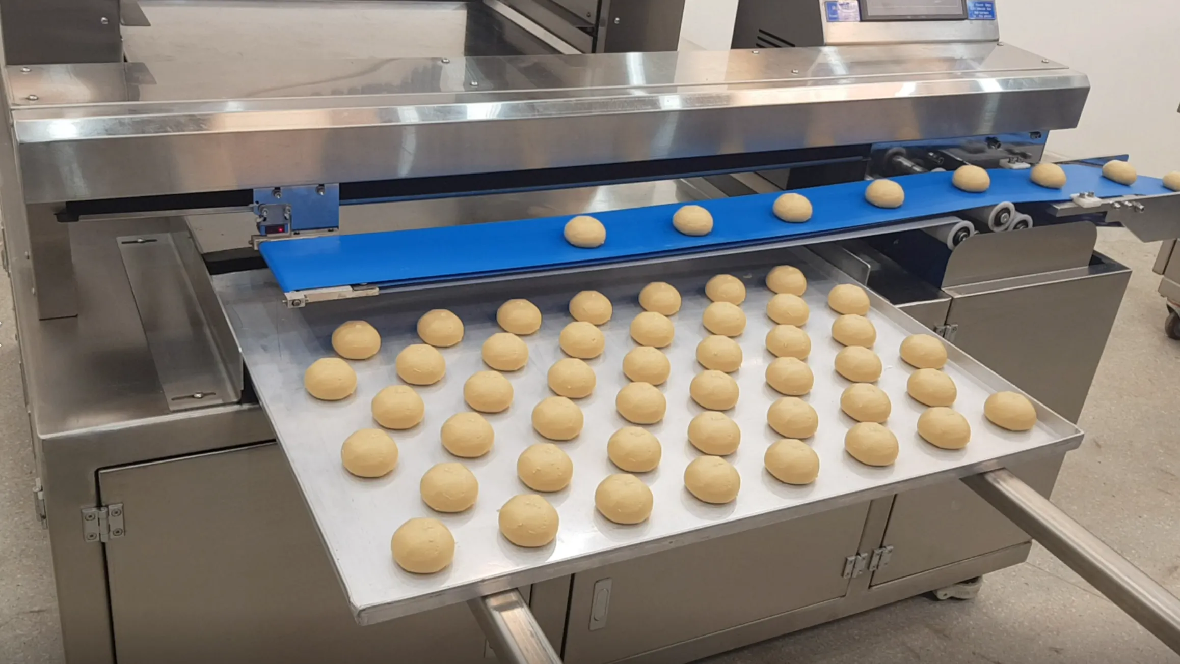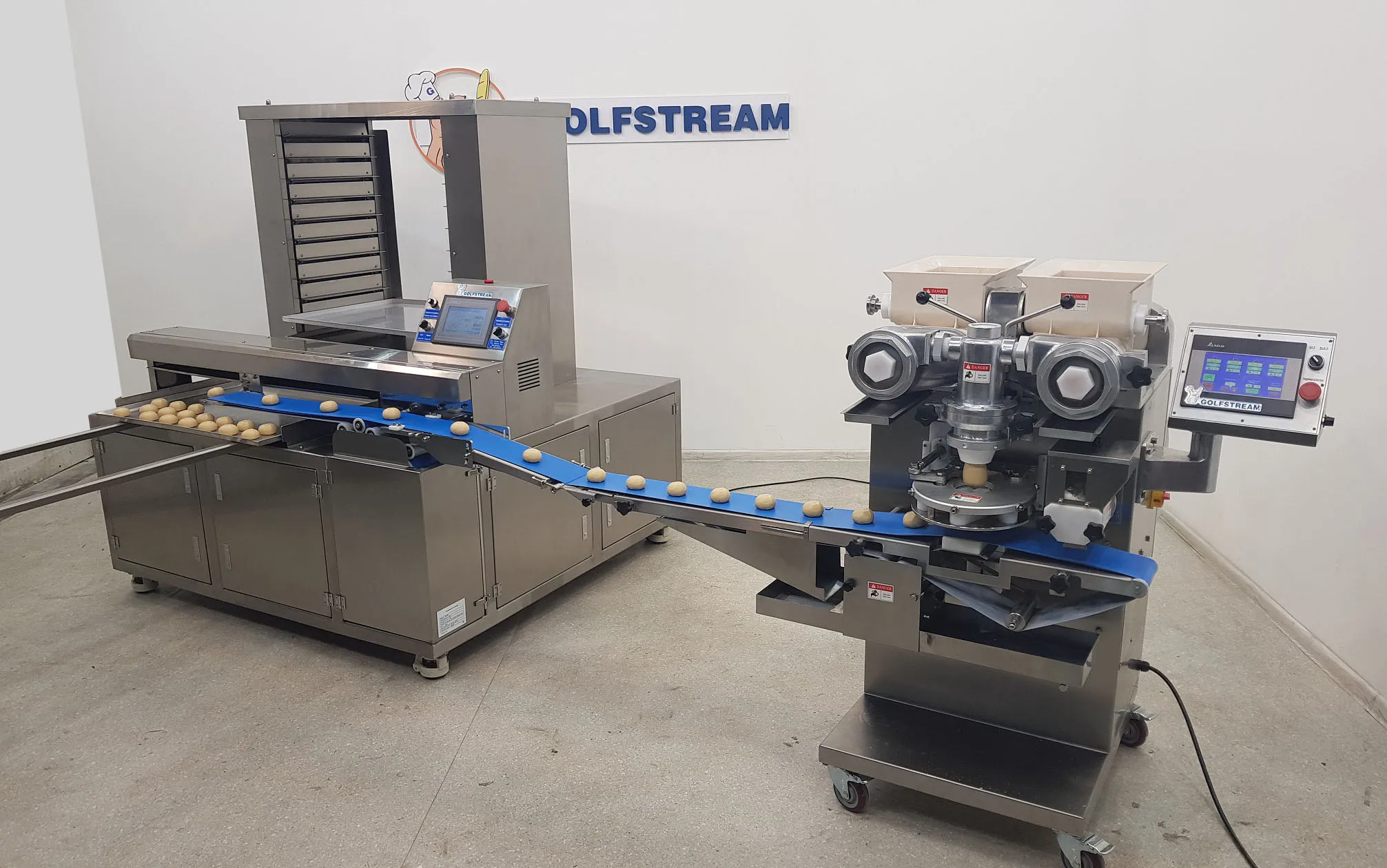 Автоматический укладчик на противни GS-500 перекладывает изделия из одного ряда поточной кондитерской линии в несколько рядов на противне.